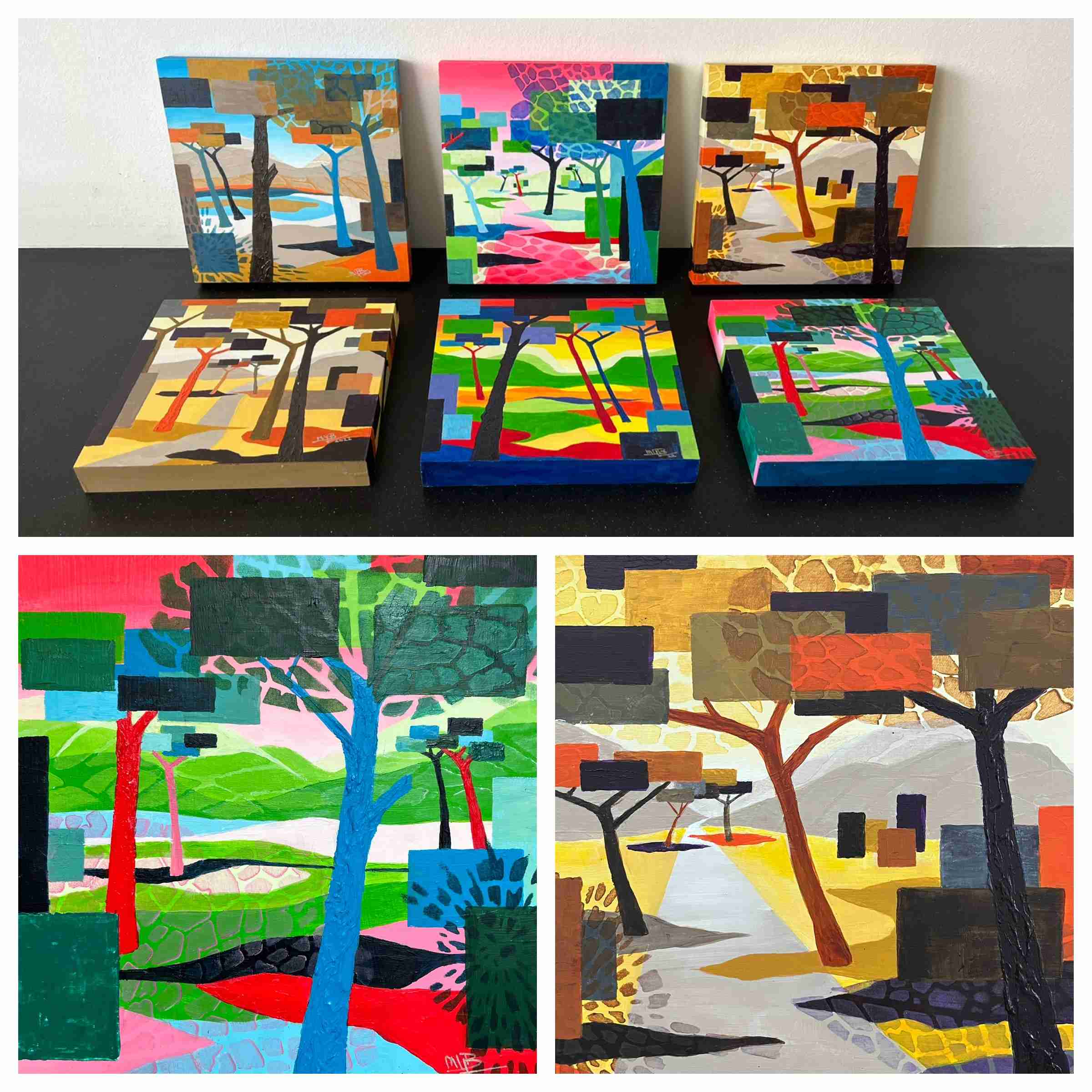 "Ondanks het kleine formaat is dit werk wandvullend door de intense kleuren en het effect van een doorlopend landschap op de dikke doeken."